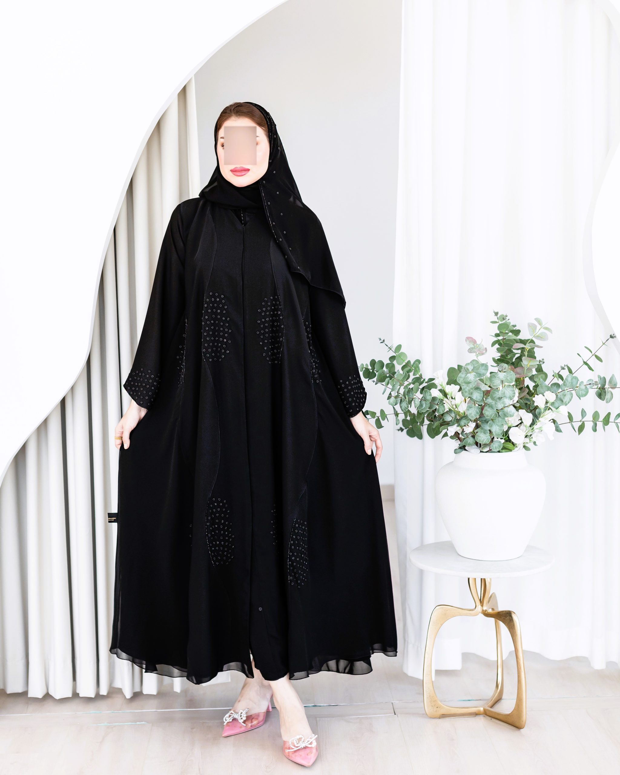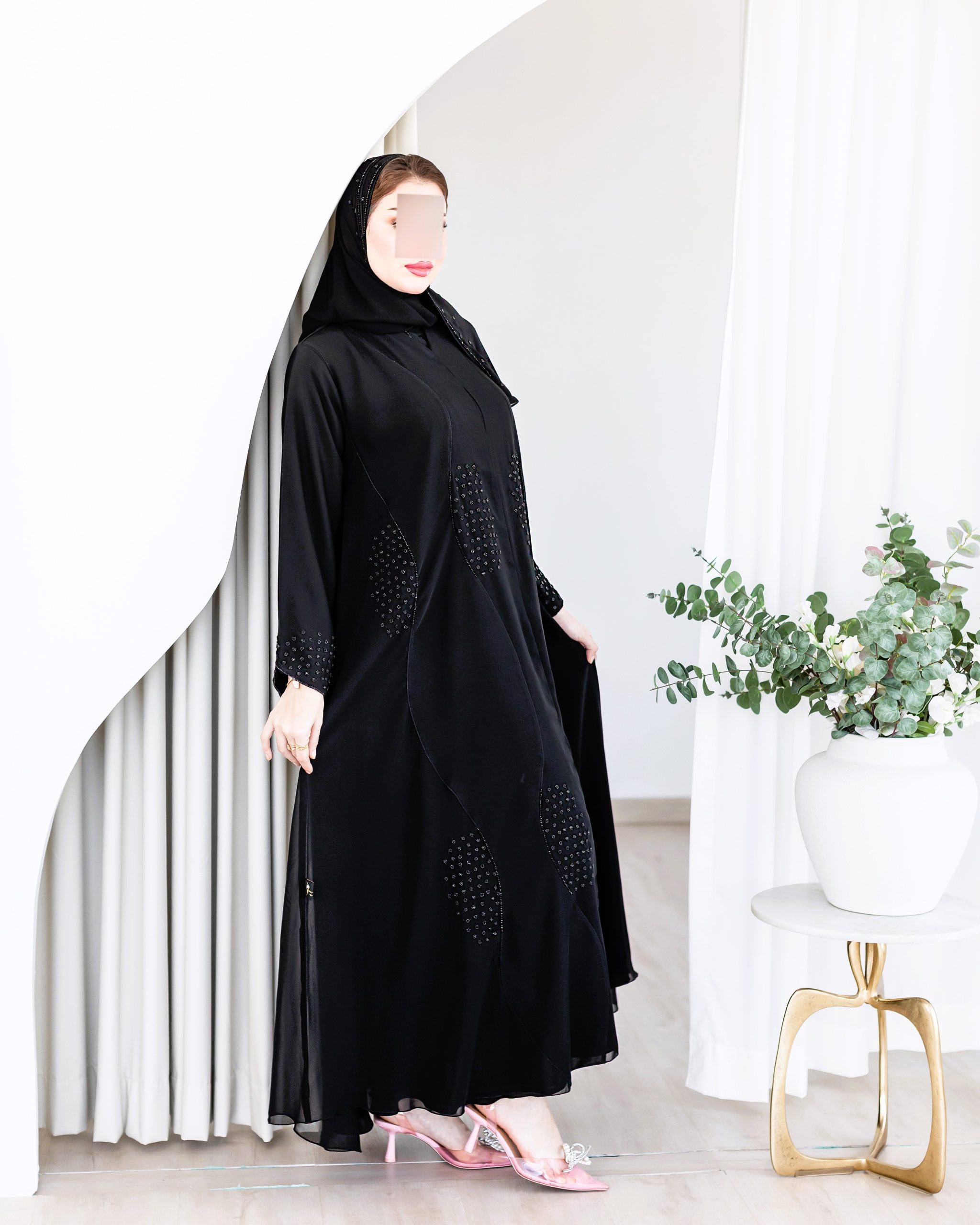 تعكس هذه العباية إحساساً بالسكينة والرقي، حيث تتألق بتفاصيل ناعمة تضفي عليها لمعة خفيفة كأنها انعكاس ضوء في لحظة صفاء، لتمنحك إطلالة راقية ومميزة في كل مناسبة