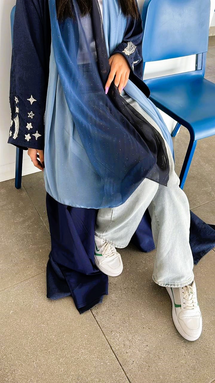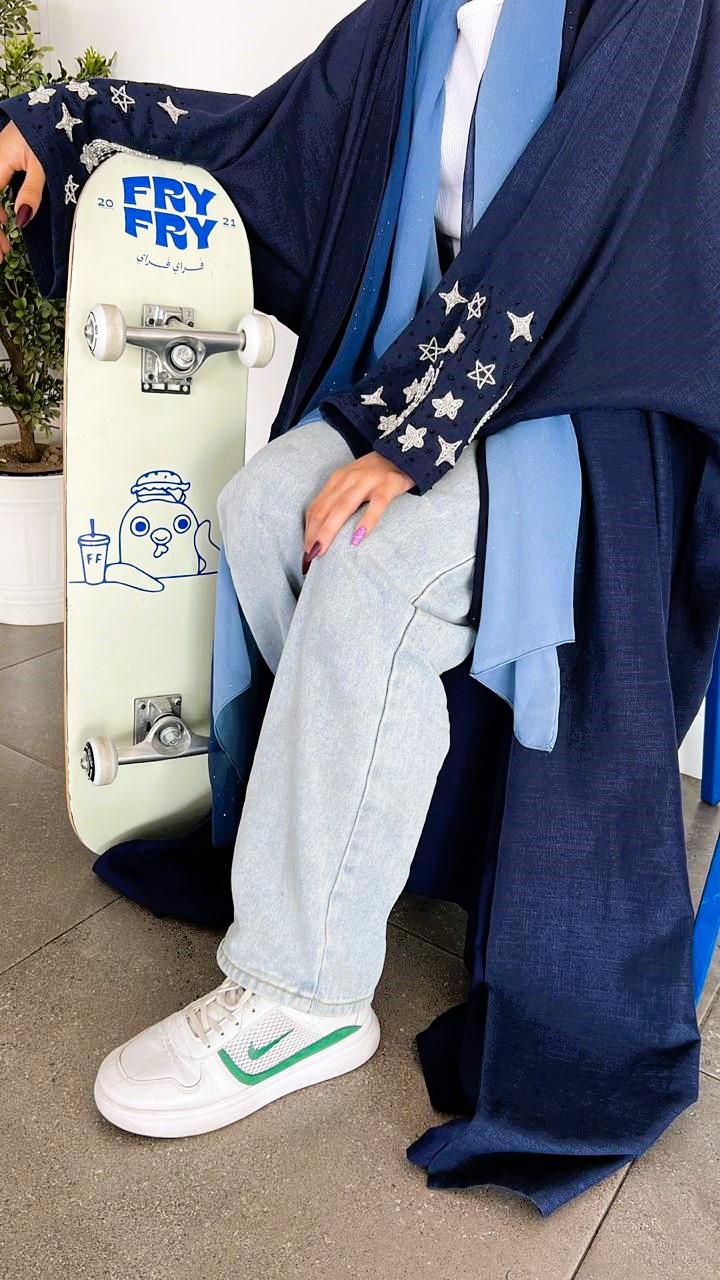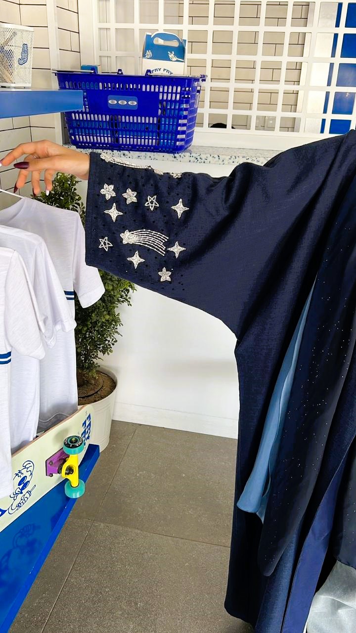 عباية ساحرة باللون الازرق الكلاسيكي، مزيّنة بتطريزات مستوحاة من الفضاء على أطراف الأكمام، تتضمن نجوم، كواكب، وشهب، مطرزة بخيوط بيضاء وخرز لؤلؤي لامع يضيف فخامة وتألق.