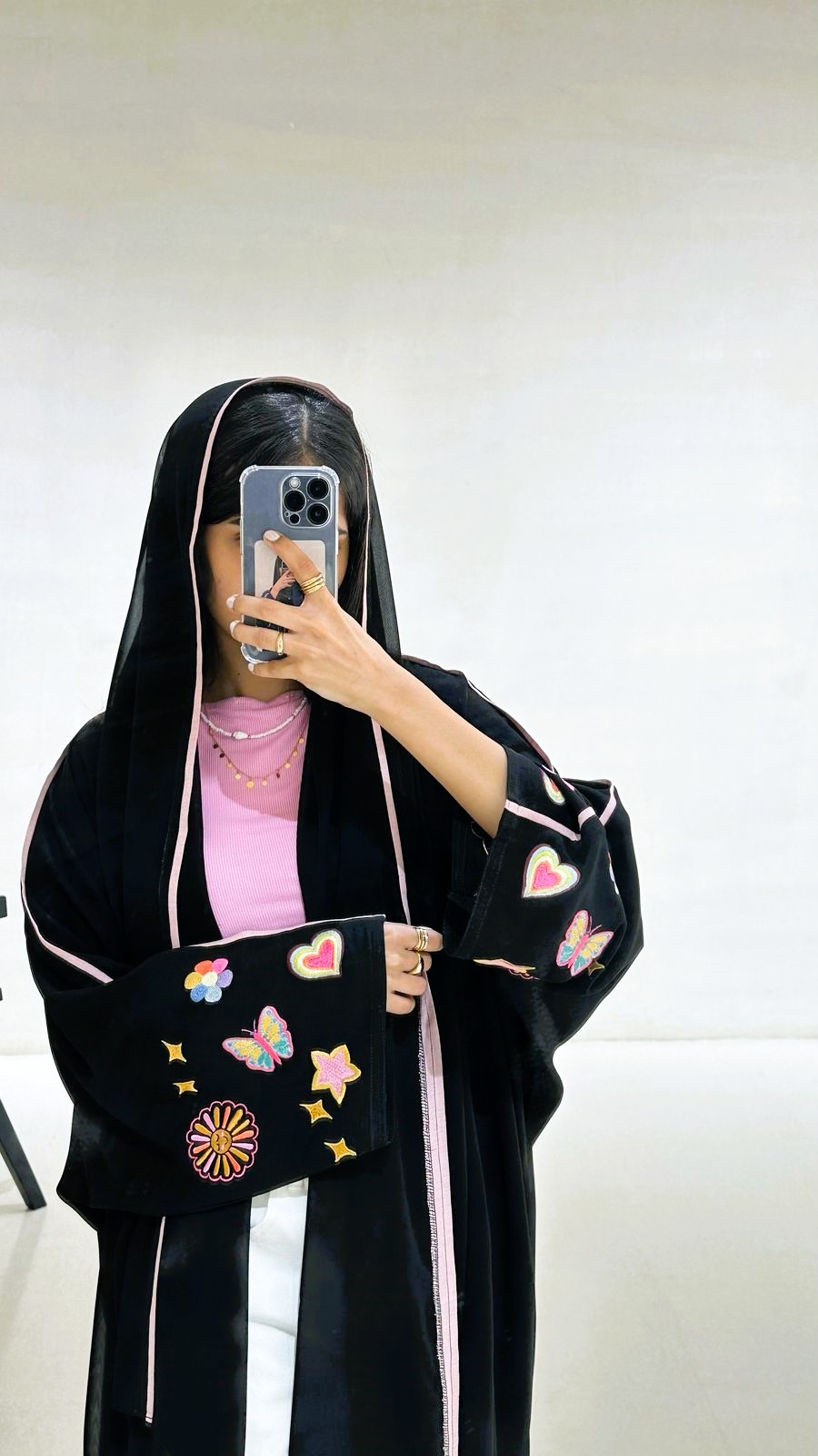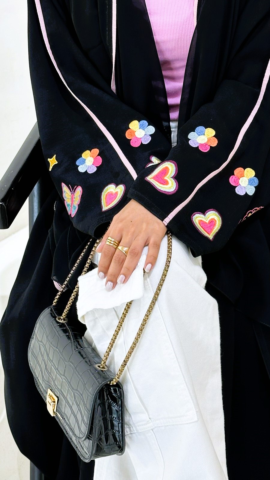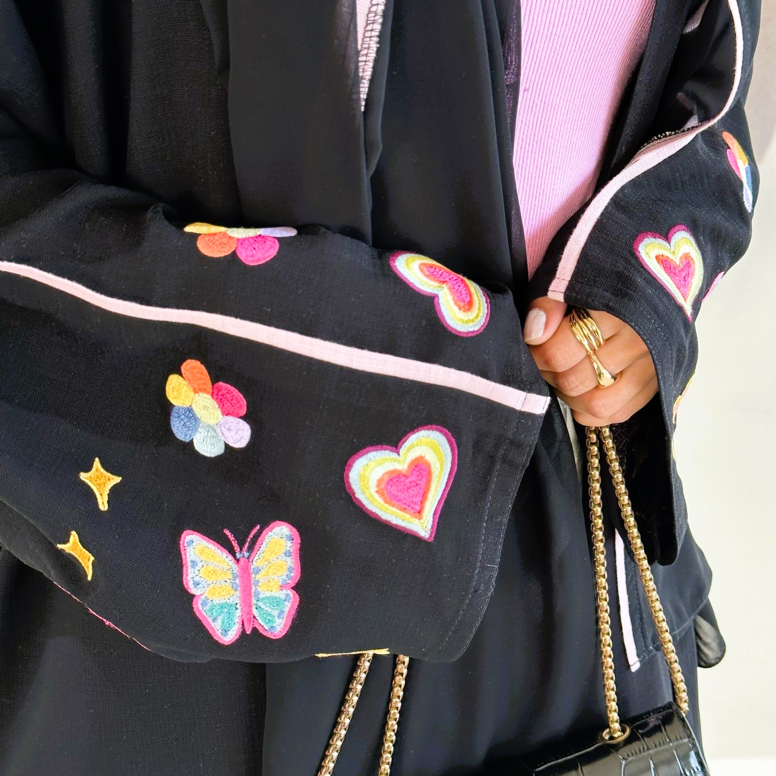 تصميم أسود أنيق مفعم بالألوان والمرح، تزيّنه تطريزات بارزة لقلوب، فراشات، ونجوم وزهور بألوان زاهية تنبض بالطاقة. الأكمام تحكي قصة من الطفولة والخيال، وكأنك ترتدين لوحة فنية تحتفل بالأنوثة والحرية.