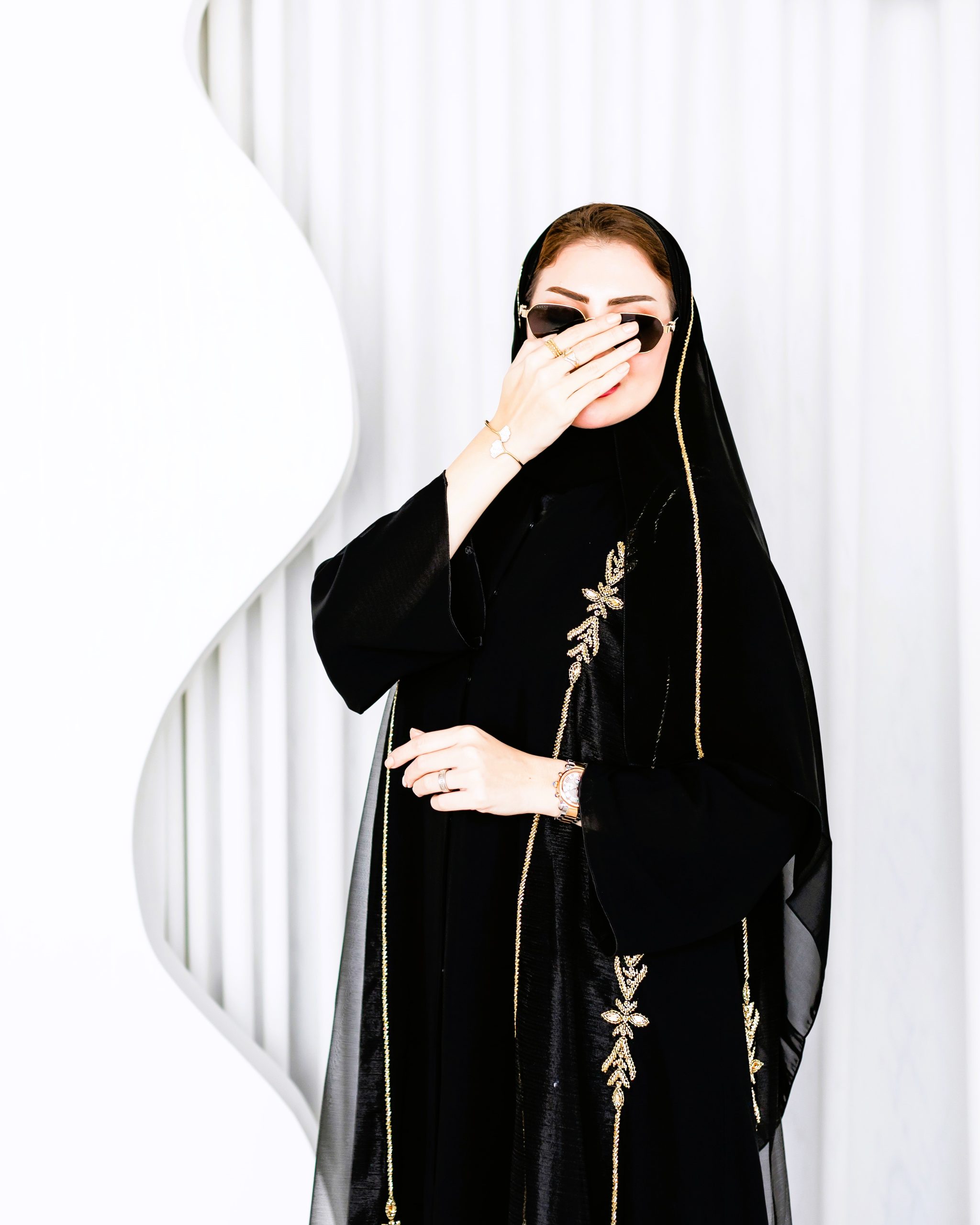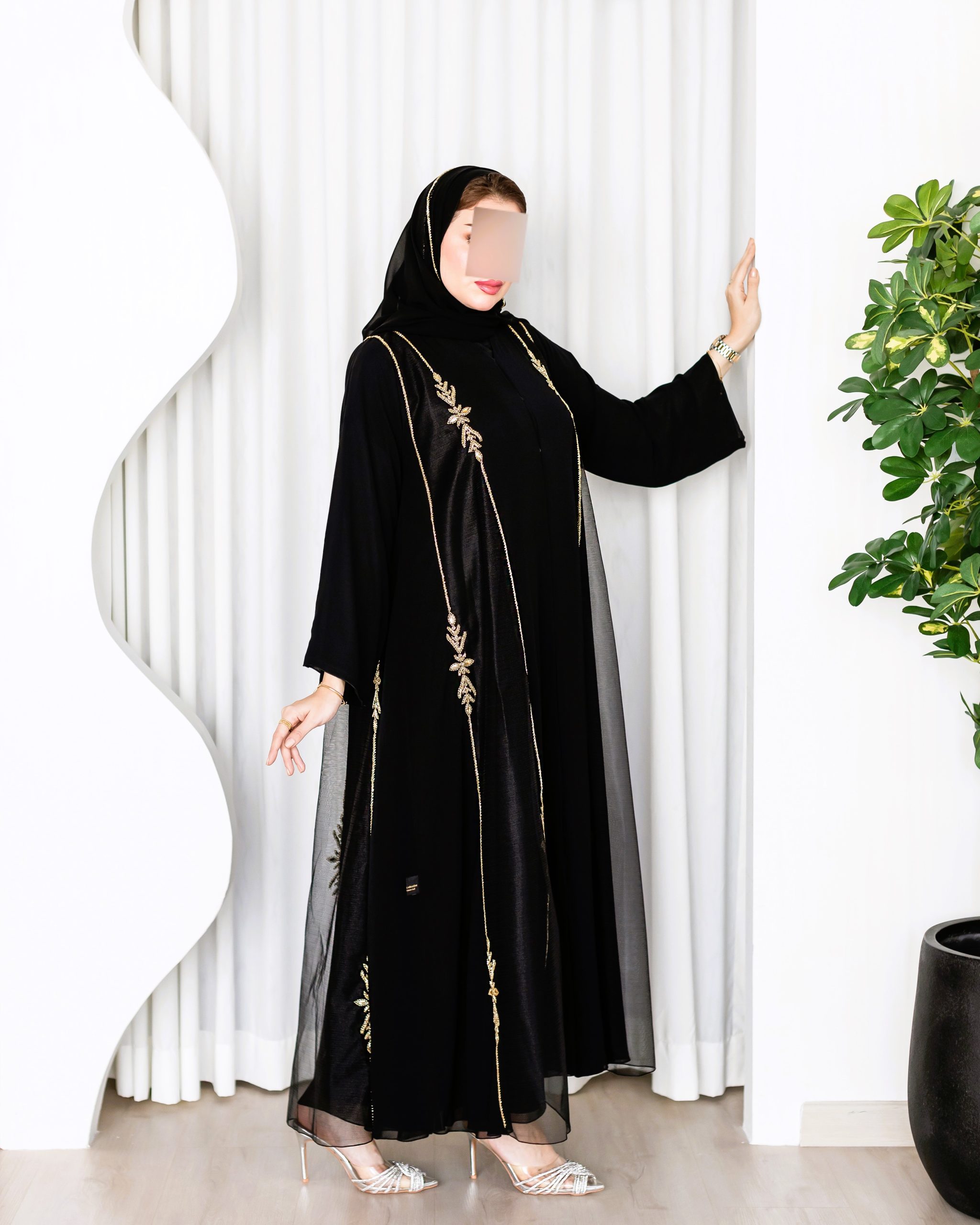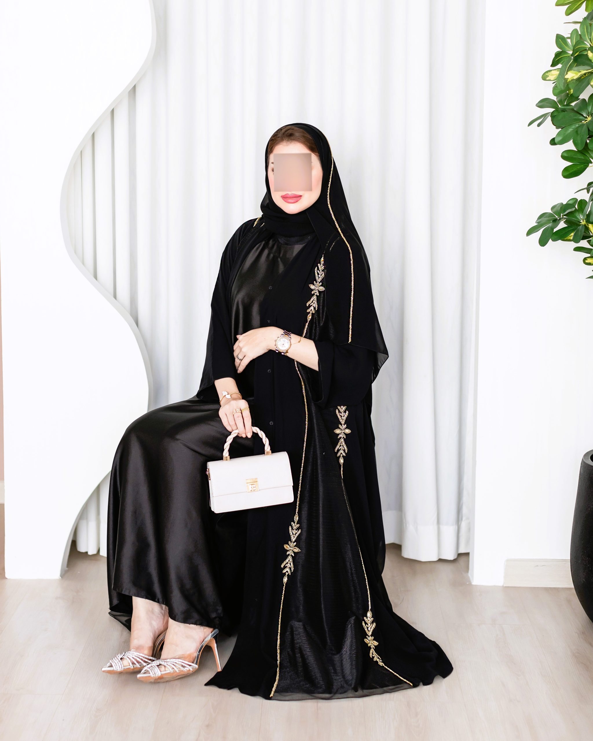 تتوزع على العباية نقوش ذهبية أنيقة على شكل أوراق وزهور صغيرة، تضيف لها لمسة من الفخامة والرقي. قماشها الشفاف الخارجي يمنحها انسيابية ساحرة، لتكون عباية مثالية للسهرات والمناسبات الخاصة بكل أناقة وثقة