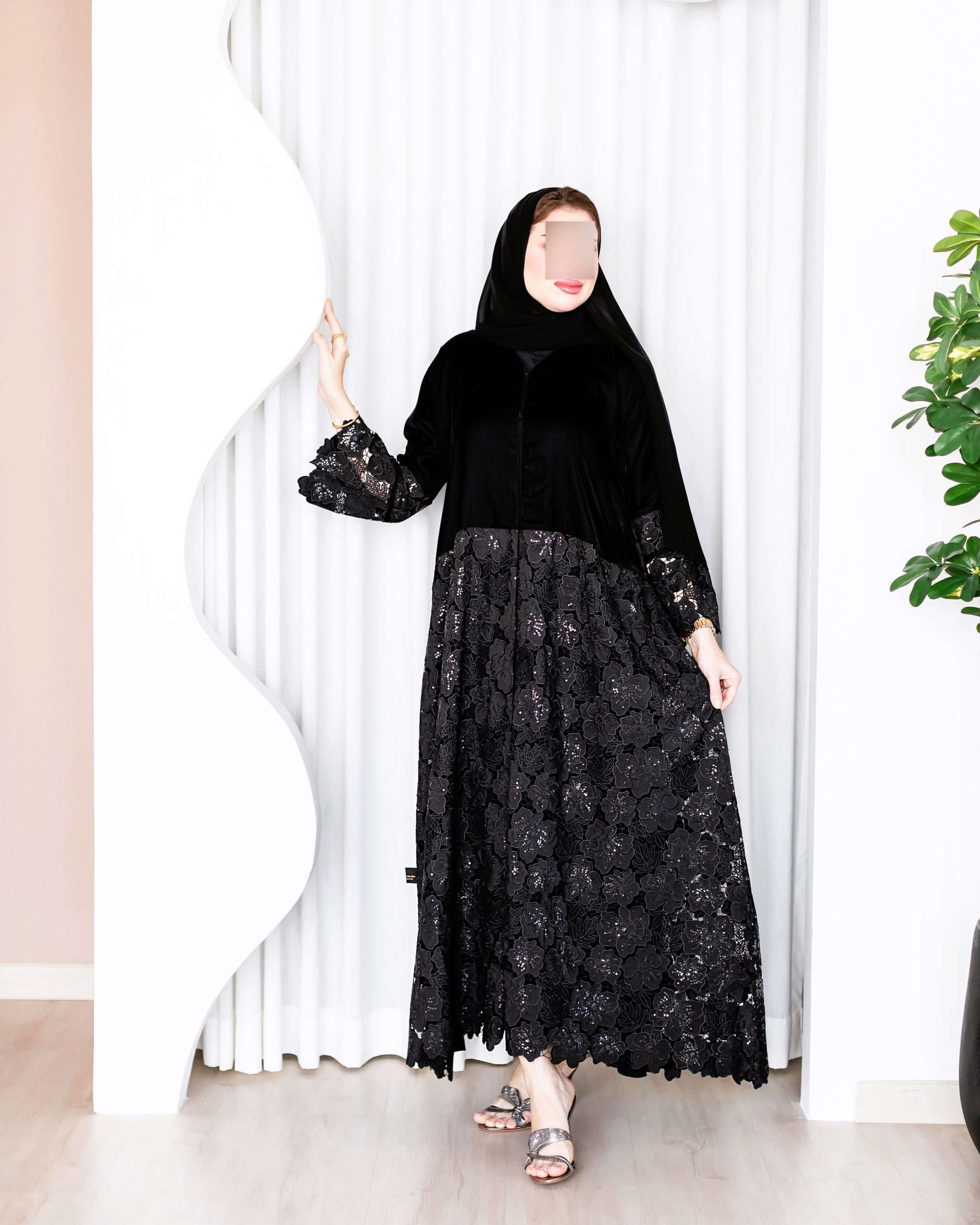 عباية دانتيل الأناقة بتصميم فاخر يجمع بين نعومة المخمل الأسود في الجزء العلوي وفخامة الدانتيل المزدان بالورود اللامعة في الجزء السفلي والأكمام.