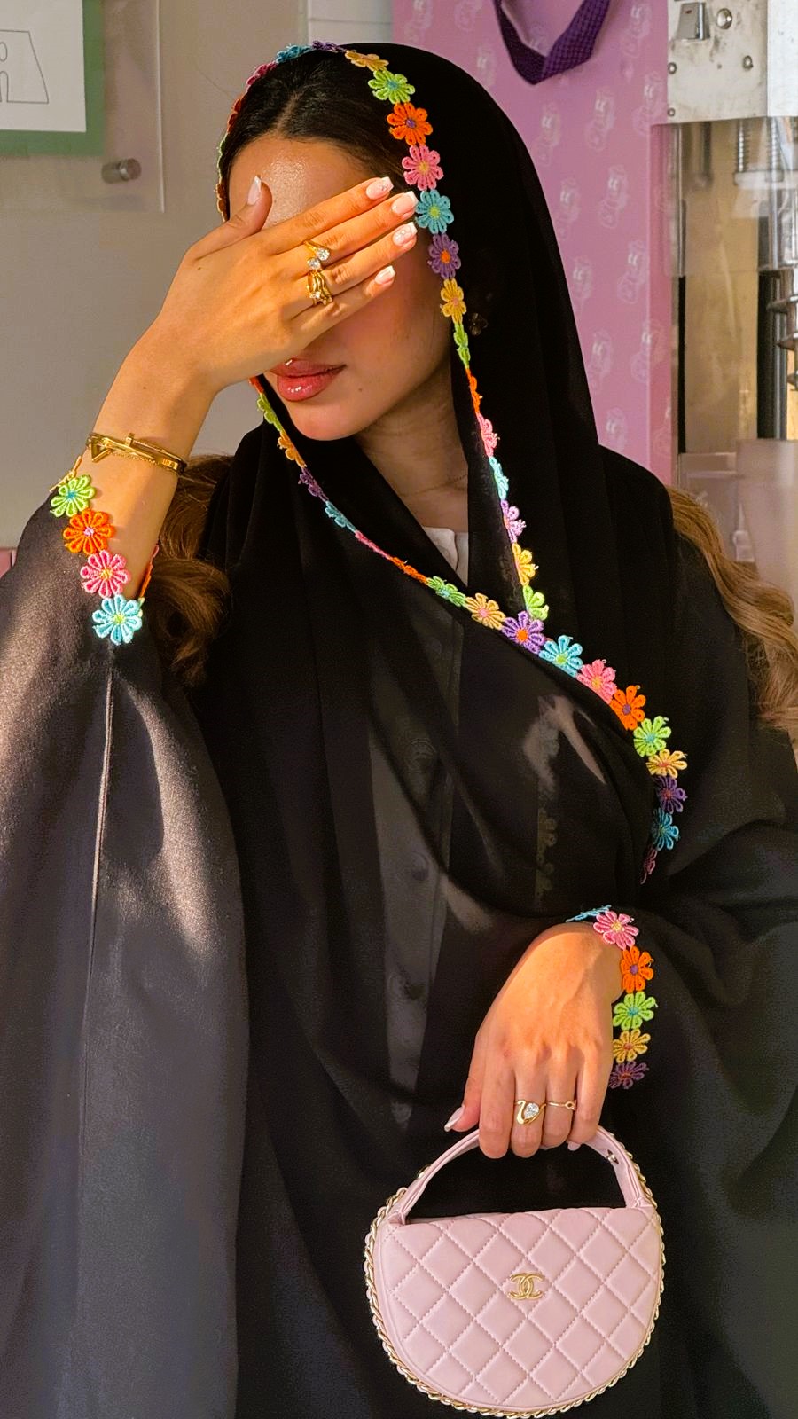 عباية سوداء ناعمة مزينة بورود دانيل ملونة على الأطراف، تجمع بين البساطة والبهجة بلمسة أنثوية مرحة