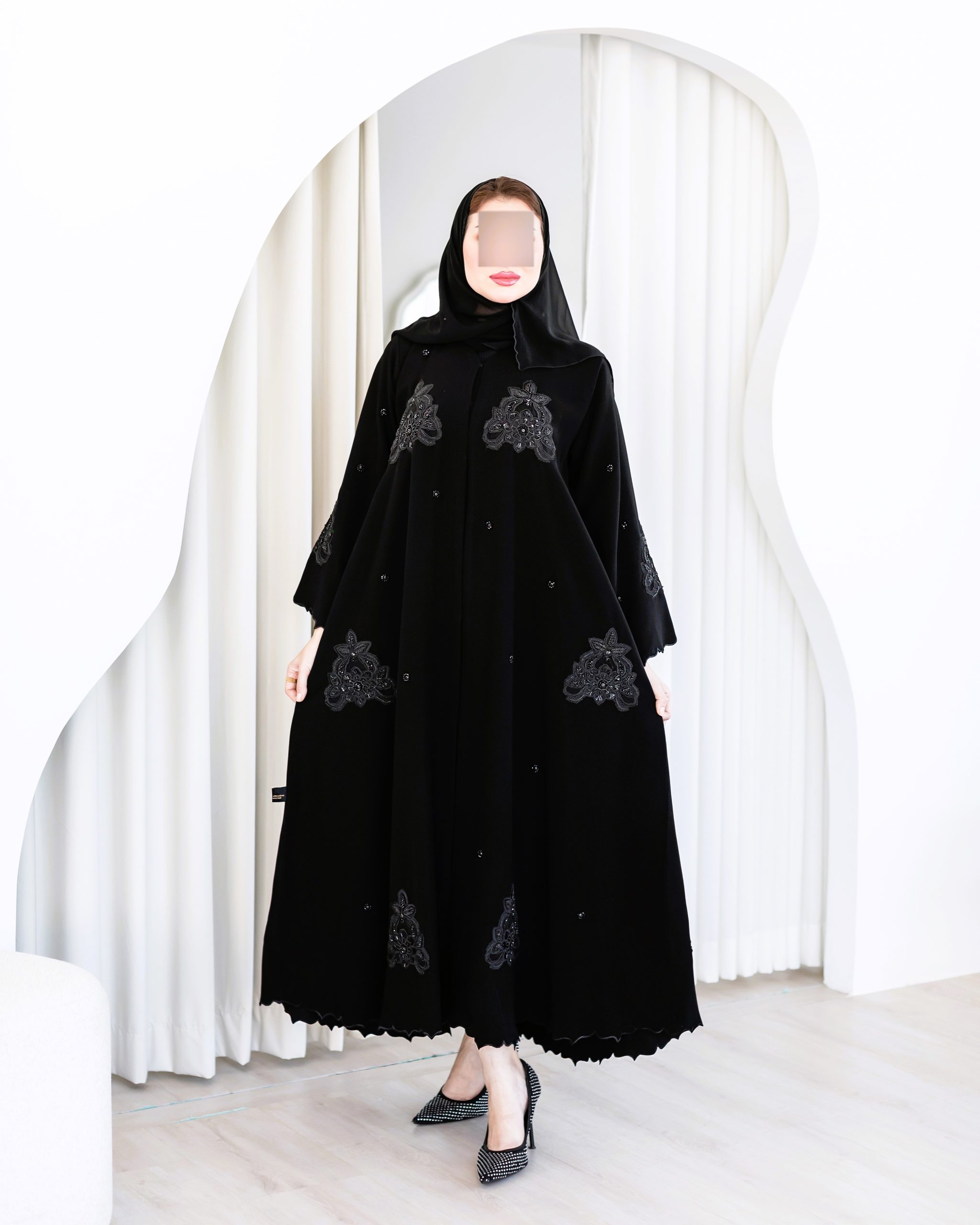 التفاصيل الدقيقة من الخرز اللامع تضيء العباية بنعومة، وأطرافها المتموجة تضفي عليها لمسة فريدة تعكس جمالكِ بكل هدوء ورقي، لتكوني دائماً متألقة بلمسة أنوثة خالصة