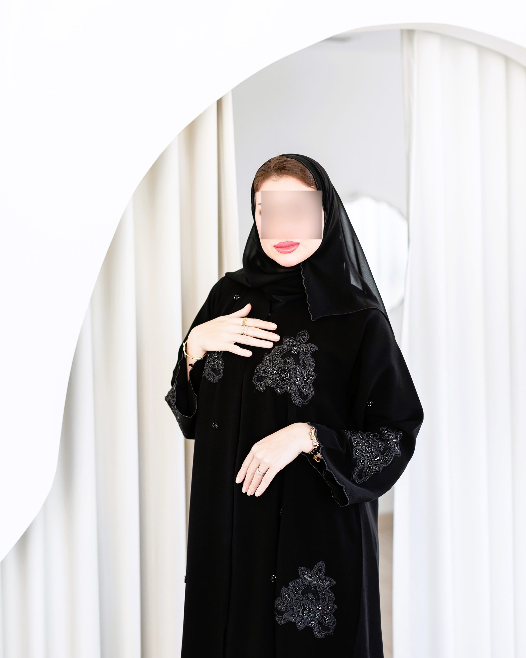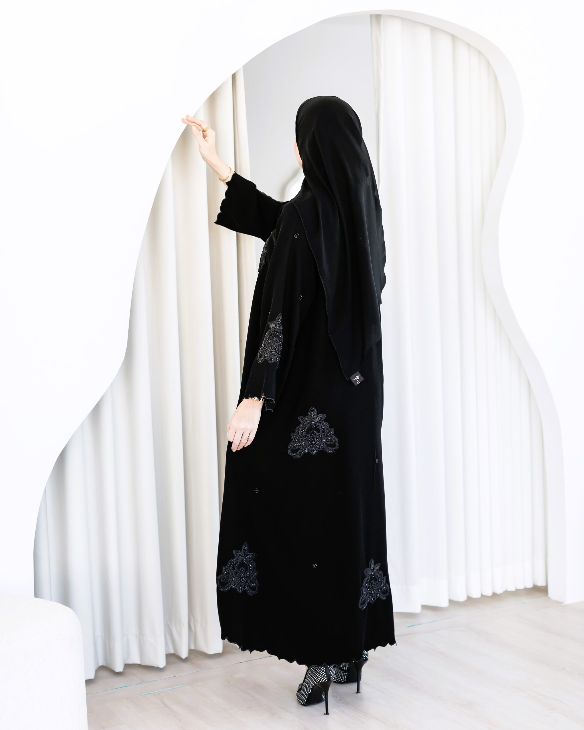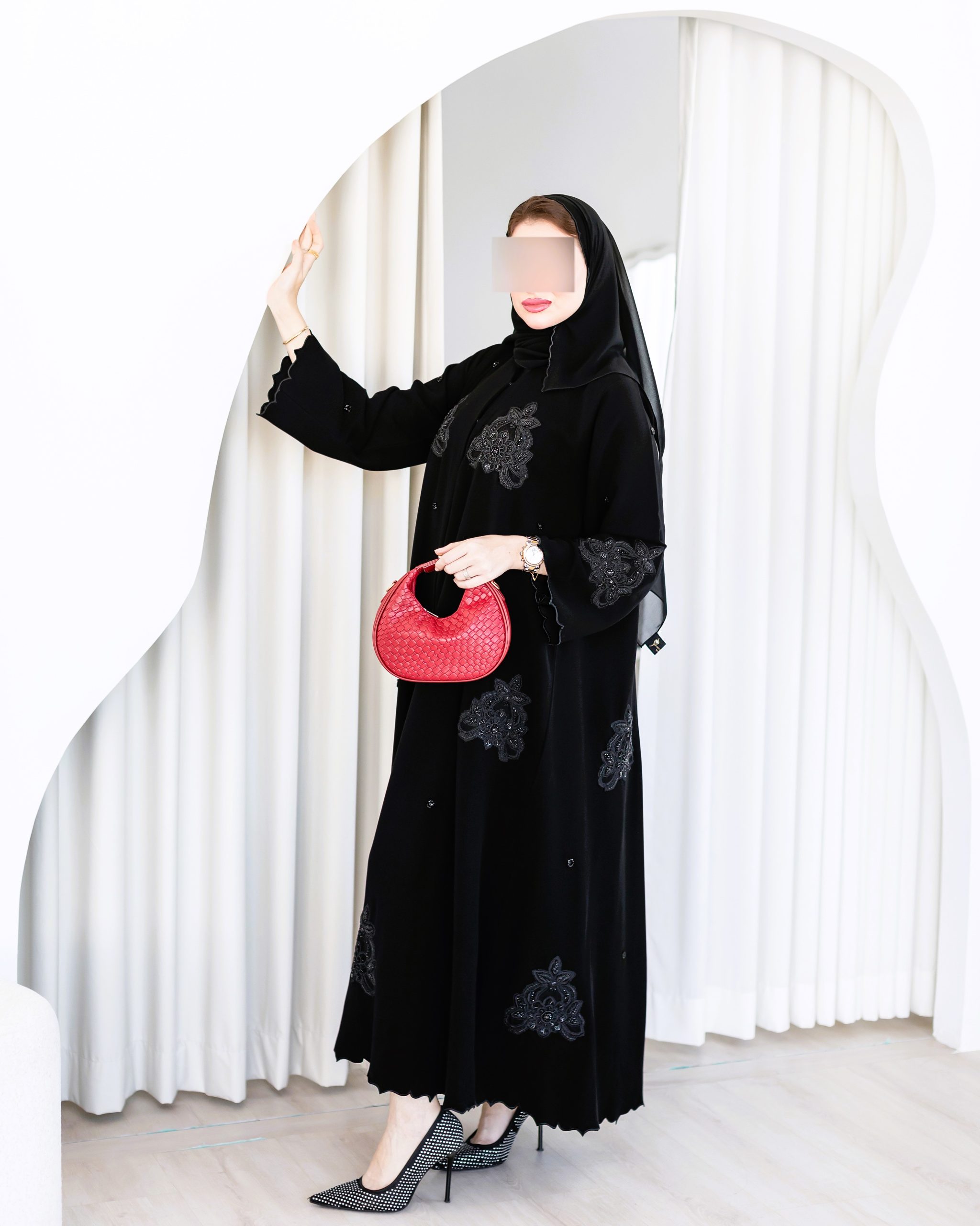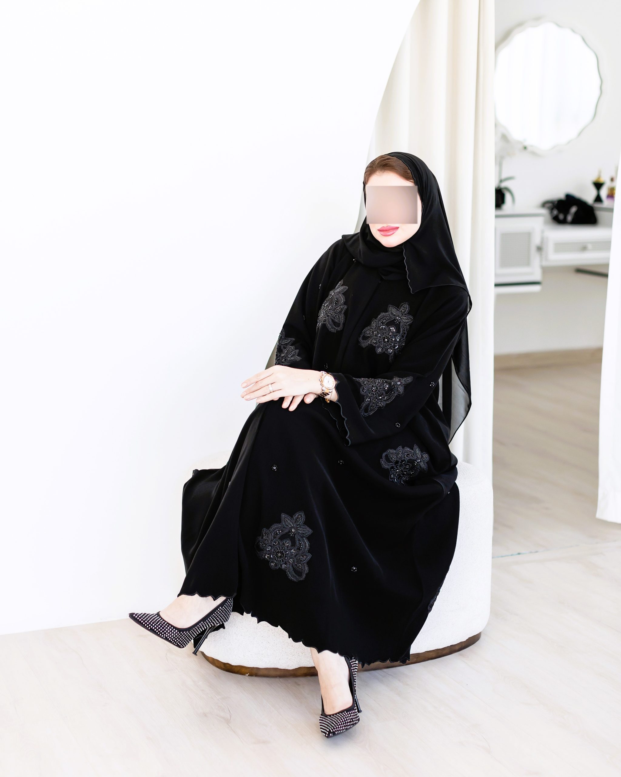 عباية لمسة الأنوثة بتصميم أسود ناعم يفيض أناقة ورقياً، مزينة بتطريز راقٍ على شكل ورود متناثرة تضيف لها طابعاً أنثوياً جذاباً.