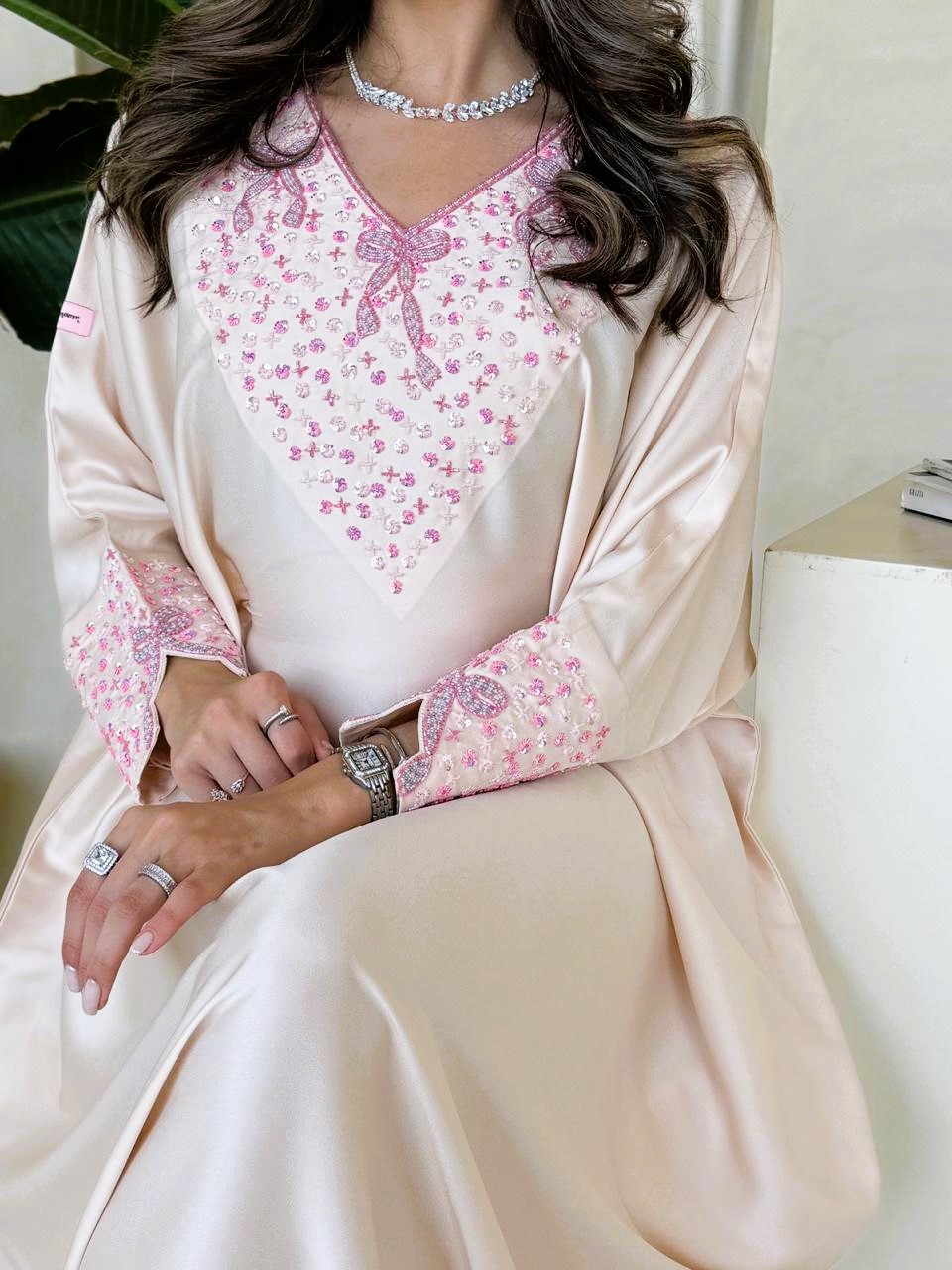 إطلالة أنثوية هادئة بطابع كلاسيكي أنيق، مصنوعة من قماش ناعم بلون بيج راقٍ، يتزين بتطريزات وردية ناعمة على الصدر والأكمام.
